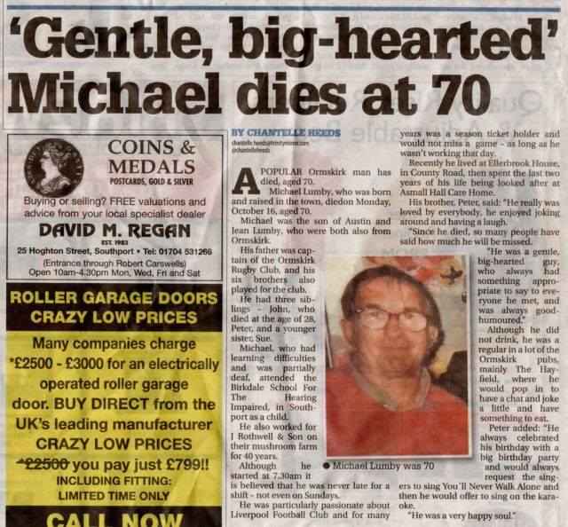 The Ormskirk Advertiser recently published an article about former member Michael Lumby who passed away on 16 October.
