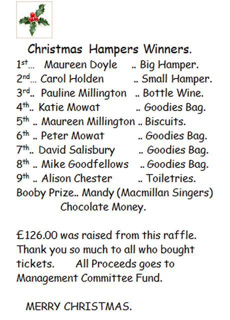 The draw for the Christmas hampers took place after the meal, and the winners are listed opposite. Thank you to Dorothy Caven for organising this fundraiser on behalf of the Management Committee.