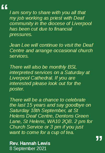 Sadly, Rev. Hannah Lewis has had to leave her job as priest within the Deaf community.
